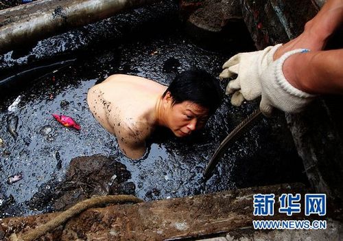隊友拍攝的現場照片,把這個只穿一條紅色內褲,在烏黑的臭水溝里摸索故障的傳統“中國男人”,演繹成了一個現代網絡紅人。