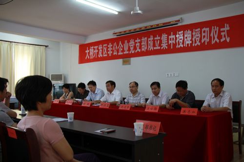 為保持黨建工作與企業發展共成長、共促進的良好局面,全面提升大橋開發區非公企業黨建工作水平,7月18日上午,大橋開發區在大橋開發區管委會黨員服務中心舉行非公企業黨支部集中成立大會。這是開發區黨的基層組織建設上的一件大事,不僅有力的推動了大橋開發區非公經濟組織領域黨建工作邁上新的臺階,更為大橋開發區實現跨越發展提供了新的動力。大會由副區長、大橋開發區黨工委副書記、紀工委書記胡駿主持。大橋開發區副主任何江玉、主任助理陳六順、大橋開發區管委會部門負責同志,新成立黨支部的12家企業業主、黨支部書記和市、區派駐企業黨建指導員共40多人參加了儀式。
