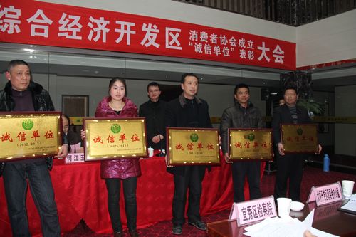 在成立大會上,還對該開發區內華治物資有限公司等20家公司頒發了“誠信單位”獎牌。(江義學)
