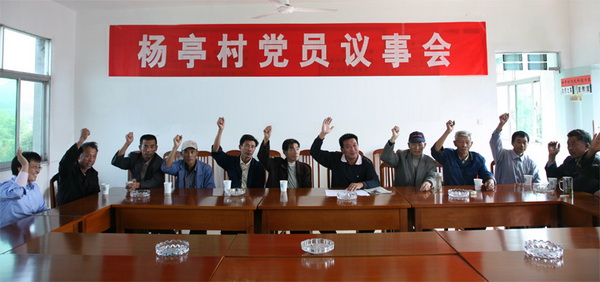 圖為:五橫鄉楊亭村在推行“四議兩公開”工作法中,結合“黨員議事會”集中審議表決該村開展村莊環境整治的場景。