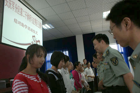 8月24日下午,在市、區(qū)婦聯(lián)相關負責同志陪同下,安慶市軍分區(qū)第二干休所所長吳仕茅、政委徐蔚帶領該所全體官兵與五橫鄉(xiāng)13名貧困生結成愛心幫扶對子,官兵們給每位學子送上助學金1000元。