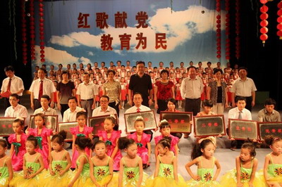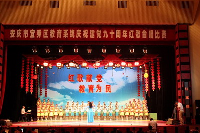 為紀(jì)念中國(guó)共產(chǎn)黨建黨90周年,弘揚(yáng)熱愛(ài)中國(guó)共產(chǎn)黨、堅(jiān)定不移跟黨走精神,引導(dǎo)全體教職工唱紅歌,更好地踐行科學(xué)發(fā)展觀,為宜秀教育工作發(fā)展?fàn)I造良好氛圍,6月23日,宜秀區(qū)教育系統(tǒng)慶祝建黨90周年紅歌合唱比賽在安慶市人民劇院隆重舉行。區(qū)領(lǐng)導(dǎo)李順琪、丁邦華、葉林霞、嚴(yán)鋒、程結(jié)書(shū)、程賢華、高青琳、曹傳文、施勤、戴蓬等饒有興致地觀看了比賽并為獲獎(jiǎng)單位頒獎(jiǎng),市教育局領(lǐng)導(dǎo)、區(qū)直部分單位、區(qū)關(guān)工委、各鄉(xiāng)鎮(zhèn)分管同志應(yīng)邀觀看了比賽。局長(zhǎng)黃虛實(shí)首先致辭。來(lái)自全區(qū)教育系統(tǒng)13家單位1200余名師生引吭高歌,抒發(fā)了對(duì)黨和祖國(guó)的火熱情懷,唱出了對(duì)美好生活的熱愛(ài)。