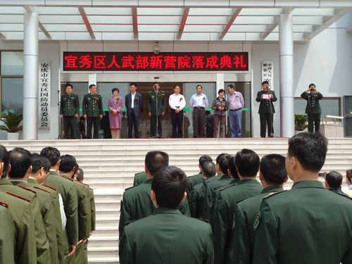 宜秀區人武部在新落成的營院內隆重舉行落成慶典,安慶軍分區司令員陳再忠應邀出席慶典并宣布宜秀區人武部新營院正式啟用。區委書記夏吉苗出席慶典并講話。區領導丁邦華、汪于飛、葉林霞、劉華、程結書、徐建軍、李亞波等出席慶典儀式,慶典儀式由區人武部政委李亞波主持。