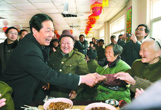 震后第11天,張寶順趕往災(zāi)區(qū)看望慰問(wèn)群眾。他首先來(lái)到了楊橋鎮(zhèn)敬老院,院墻外大紅燈籠高高懸掛,豐盛的年貨堆滿了房間,處處洋溢著濃厚的節(jié)日氣氛。得知敬老院受損房屋已修繕,這里100多位老人在農(nóng)歷小年之前全部搬回入住,張寶順十分高興。他走進(jìn)餐廳,與正在就餐的老人們親切握手,關(guān)切地詢問(wèn)老人們的身體生活情況,并預(yù)祝老人們新春愉快、身體健康。聽(tīng)到大家連聲稱贊,張寶順舒心地笑了。他說(shuō),地震讓楊橋鎮(zhèn)不少房屋受損,大家的生活遇到了困難,但這只是暫時(shí)的影響。各級(jí)黨委、政府高度重視,十分關(guān)心受災(zāi)群眾的生活,迅速啟動(dòng)救災(zāi)工作,妥善安置大家,受損房屋及時(shí)進(jìn)行修繕,就是要讓大家盡快返回入住,過(guò)上一個(gè)歡樂(lè)祥和的新春佳節(jié)。