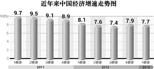 中國經(jīng)濟在2012年走出了下行、企穩(wěn)、回升的曲線后,今年一季度GDP同比增幅又回了一下頭,從去年四季度的7.9%降到7.7%,人們的疑慮和擔心由是而生。