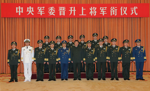 7月31日,中央軍委在北京八一大樓隆重舉行晉升上將軍銜儀式。中央軍委主席習近平向晉升上將軍銜的同志頒發命令狀。這次晉升上將軍銜的6位高級軍官是:總政治部副主任吳昌德、總裝備部政治委員王洪堯、軍事科學院政治委員孫思敬、北京軍區政治委員劉福連、南京軍區司令員蔡英挺、廣州軍區司令員徐粉林。這是儀式結束后,習近平等領導同志與晉升上將軍銜的軍官合影留念。