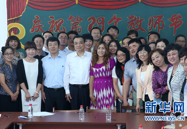 在學校會議室,李克強同教師代表座談。他說,明天是你們的節日,我代表黨中央、國務院向在座各位并向全國的教育工作者致以節日問候,衷心感謝大家為教育事業付出的辛勞和心血。曾參加援疆援藏支教、從事新疆班教學和從貴州、新疆等地來進修的老師們爭相發言,談了體會和感受。援藏的老師還給總理送上一張反映支教生活的光盤,李克強愉快地收下,并表示會好好看。他說,你們懷著一顆熱愛教育的心,為邊遠貧困地區孩子帶去知識和希望,匯聚起促進教育公平的積極力量。要鼓勵更多人才到西部支教,讓更多西部教師到東部培訓,這不僅可以提高西部教育水平,更是揚起了一面旗幟,放飛了希望,讓貧困地區的孩子感到有前途、有奔頭。