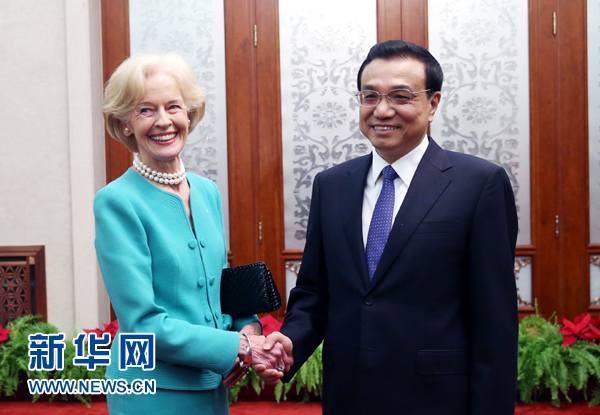 10月17日,國(guó)務(wù)院總理李克強(qiáng)在北京人民大會(huì)堂會(huì)見(jiàn)澳大利亞總督布賴斯。 新華社記者 姚大偉 攝