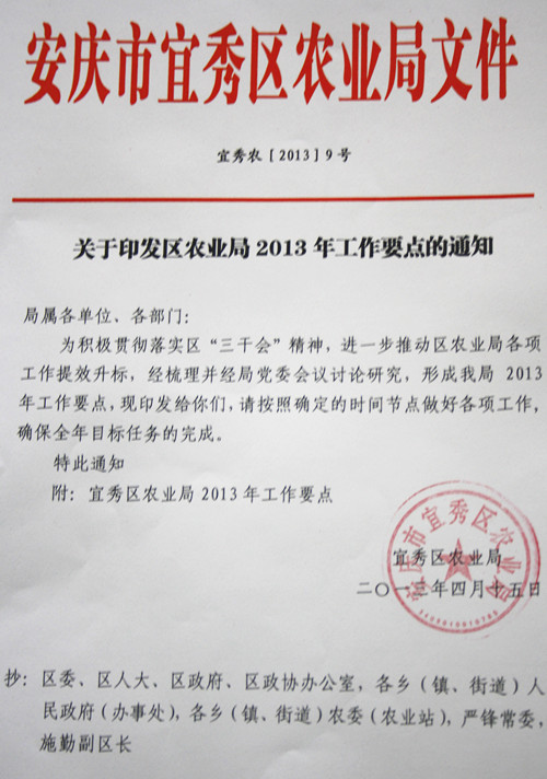 | 組織2013年農業產業化工作考評。12月底組織6家生產加工型、2家營銷型農業產業化龍頭企業參加考評優秀龍頭企業,組織3家參加品牌先進單位考評,并完成宜秀區農業產業化綜合考評材料。 | 江學立 | 綜合發展股 | ||