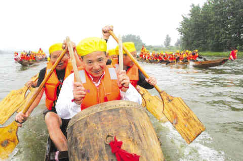 下午2點龍舟賽在羅嶺鎮岱賽湖上舉行,9條龍舟一字排開,伴著熱烈的鼓點,選手們劈波斬浪,揮汗如雨。狹長的龍舟如同離弦的箭一樣向終點疾馳。岸上,歡呼聲、吶喊聲、鞭炮聲,響徹云霄。這時候,人們已經不注重比賽的輸贏,而更在乎積極參與了。人們在自娛自樂中傳承著古老的中華文化,演繹著流傳千年的風俗習慣。