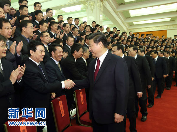 1月6日,黨和國家領導人習近平、李克強、張德江、俞正聲、劉云山、王岐山、張高麗等在北京人民大會堂會見探月工程嫦娥三號任務參研參試人員代表。新華社記者 蘭紅光 攝