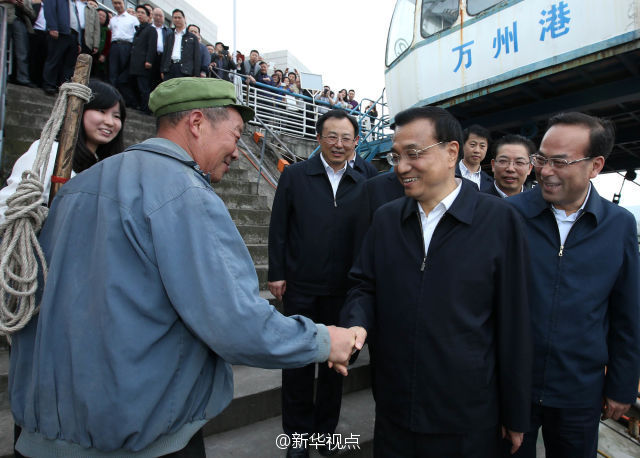 李克強(qiáng)總理27日在重慶萬州港乘船考察長江黃金水道。他來到輪船甲板上,認(rèn)真觀察港口基礎(chǔ)設(shè)施和航道建設(shè)現(xiàn)狀,與有關(guān)部門負(fù)責(zé)人共商長江黃金水道未來發(fā)展大計(jì)。李克強(qiáng)說,長江黃金水道是貫通東中西部、通航能力最強(qiáng)的航道,要用黃金水道串起長江經(jīng)濟(jì)帶“珍珠鏈”。