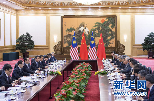 李克強表示,馬來西亞是中國的友好鄰國和在東盟的重要合作伙伴。建交40年來,兩國政府和人民持續推進中馬友好合作大業。去年,習近平主席訪問馬來西亞,取得豐碩成果。今年是中馬建交40周年,中方愿與馬方以此為契機,增進政治互信,加強戰略溝通,拓展和深化務實合作,充實中馬全面戰略伙伴關系內涵,擴大利益融合,實現共同繁榮。