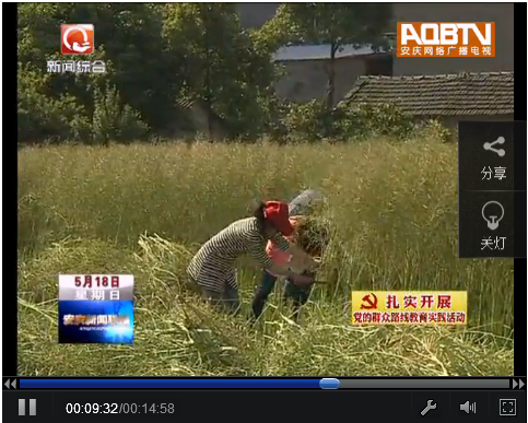 5月18日《安慶新聞聯播》刊播白澤湖鄉組織志愿者幫助計生困難家庭收割油菜