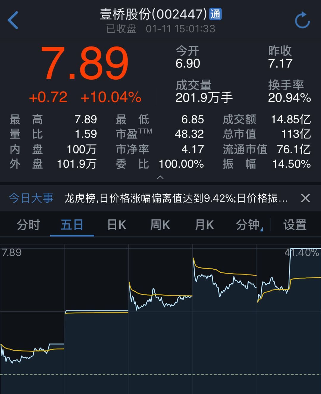 2、壹橋股份(8.4800.597.48%)則以近50%的漲幅位居第二。公開資料顯示,這家公司改名的速度幾乎可與曾經的匹凸匹媲美。2010年,公司以 “壹橋苗業(yè)”的名稱登陸A股,到了2015年1月更名為“壹橋海參”,2016年10月由于形成了海珍品和移動游戲“雙主業(yè)”,又更名為為“壹橋股份”,2017年12月1日,又由于當前不再存在海珍品業(yè)務,試圖更名為“晨鑫智能”,但在遭到來自監(jiān)管層的問詢后暫時作罷。
