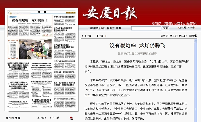“龍到鞭炮響,這是舞龍的老規(guī)矩。但是今年,市區(qū)推行煙花爆竹禁限放,春節(jié)期間指定地點燃放,紅廟龍燈隊將舞動一場沒有鞭炮污染的新春。”王克亮表示。