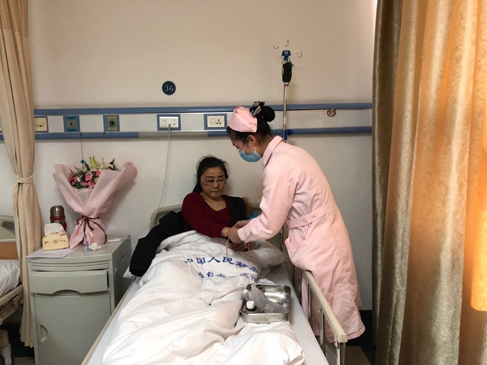 躺在病床上的斯綠平不好意思,用手遮著臉,愛美的女性總想著在鏡頭里的自己臉上有傷不好看,也一直念叨著那天晚上和第三小組組長潘健一起去拆遷戶家的,不知道協議簽下來了沒有。16號傍晚,燒飯大姐做完飯,好心的斯綠平想著路途有點遠,就騎著電動車送大姐回家,然后急忙趕回指揮部,撞上窨井蓋嚴重摔傷,在冰冷的地上昏迷了幾十分鐘,等她醒來,發現自己渾身是血,打電話給老公,大家齊心把她送到醫院經過檢查,左手大拇指斷裂,上顴骨、鼻梁骨裂,額頭撕裂,臉上多處皮膚擦傷,現縫了10余針,上顴骨骨裂嚴重,經專家會診可能要到上海做修容手術。