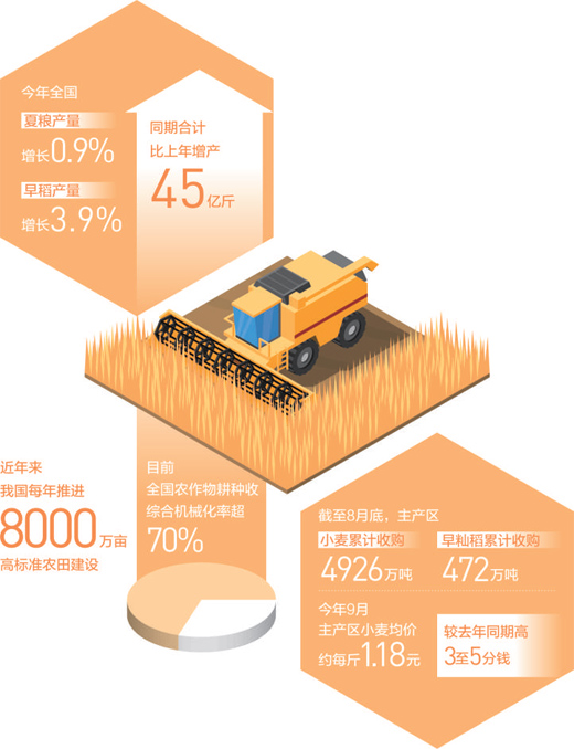 又到一年金秋季。國家統計局日前公布,全國夏糧產量增長0.9%,早稻增長3.9%,同期合計比上年增產45億斤,目前已經豐收到手。