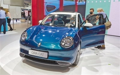 一家中國車企在德國舉行的車展上向觀眾展示最新款電動汽車。