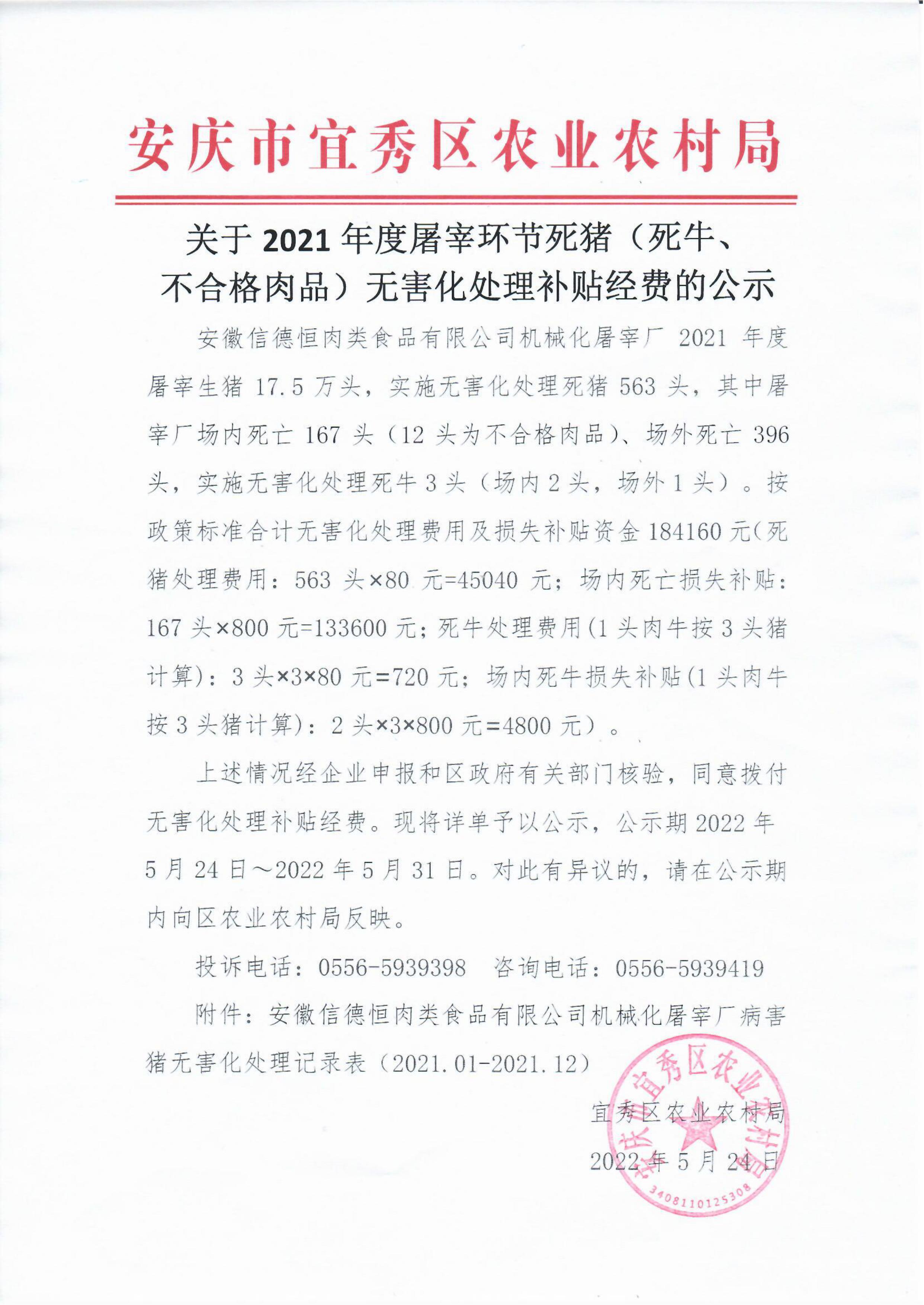 關于2021年度屠宰環節無害化處理補貼經費的公示