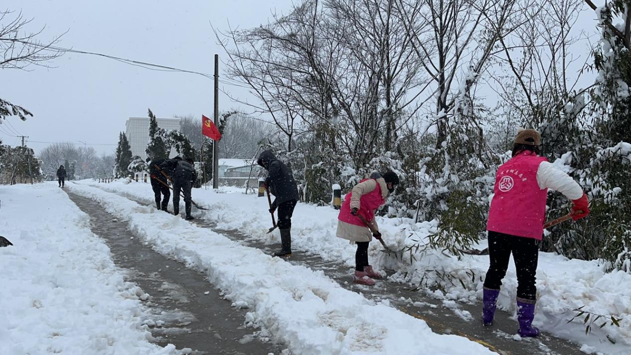 “喂,是雪年嗎?吳家老屋的自來水管道凍裂了,農戶家里停水,需要水電工搶修,請迅速安排處理。”期間,有村民打電話向村委會副主任楊雪年求助。事情緊急,楊雪年當即聯系水務公司人員去現場搶修,并馬不停蹄地趕到村民組將自來水閥關閉,來不及喘一口氣,她轉身又投入到了鏟雪除冰的行動中。