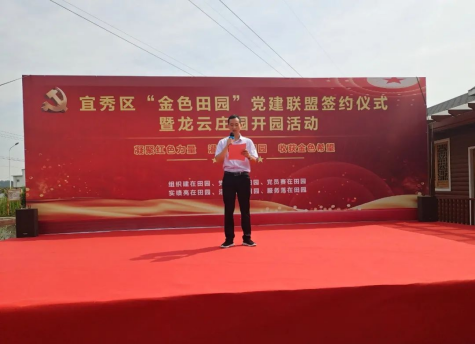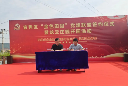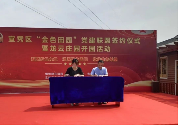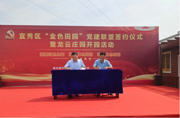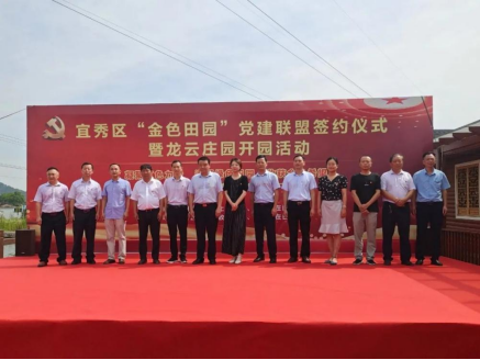 活動現場,宜秀區委組織部機關黨支部、宜秀區林業局機關黨支部、宜秀區農業技術推廣中心黨支部、宜秀區五橫鄉白林村林豐黨支部、安徽省龍云生態農林開發有限公司黨支部、安徽省潤普納米科技股份有限公司黨支部共同簽訂黨建聯盟協議,以“凝聚紅色力量,灌溉綠色田園,收獲金色希望”為目標,打造有力度、有亮度、有溫度、有廣度的宜秀“金色田園”黨建聯盟品牌。         區委組織部副部長、老干部局局長黃叢超代表中共宜秀區委非公工委向宜秀區“金色田園”黨建聯盟成功簽約和龍云生態莊園開園表示祝賀。