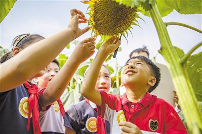 在重慶兩江新區星湖學校教學樓頂的向日葵園,學生們在向日葵全融合趣評嘉年華測評中采集向日葵標本。 新華社記者 黃偉攝
