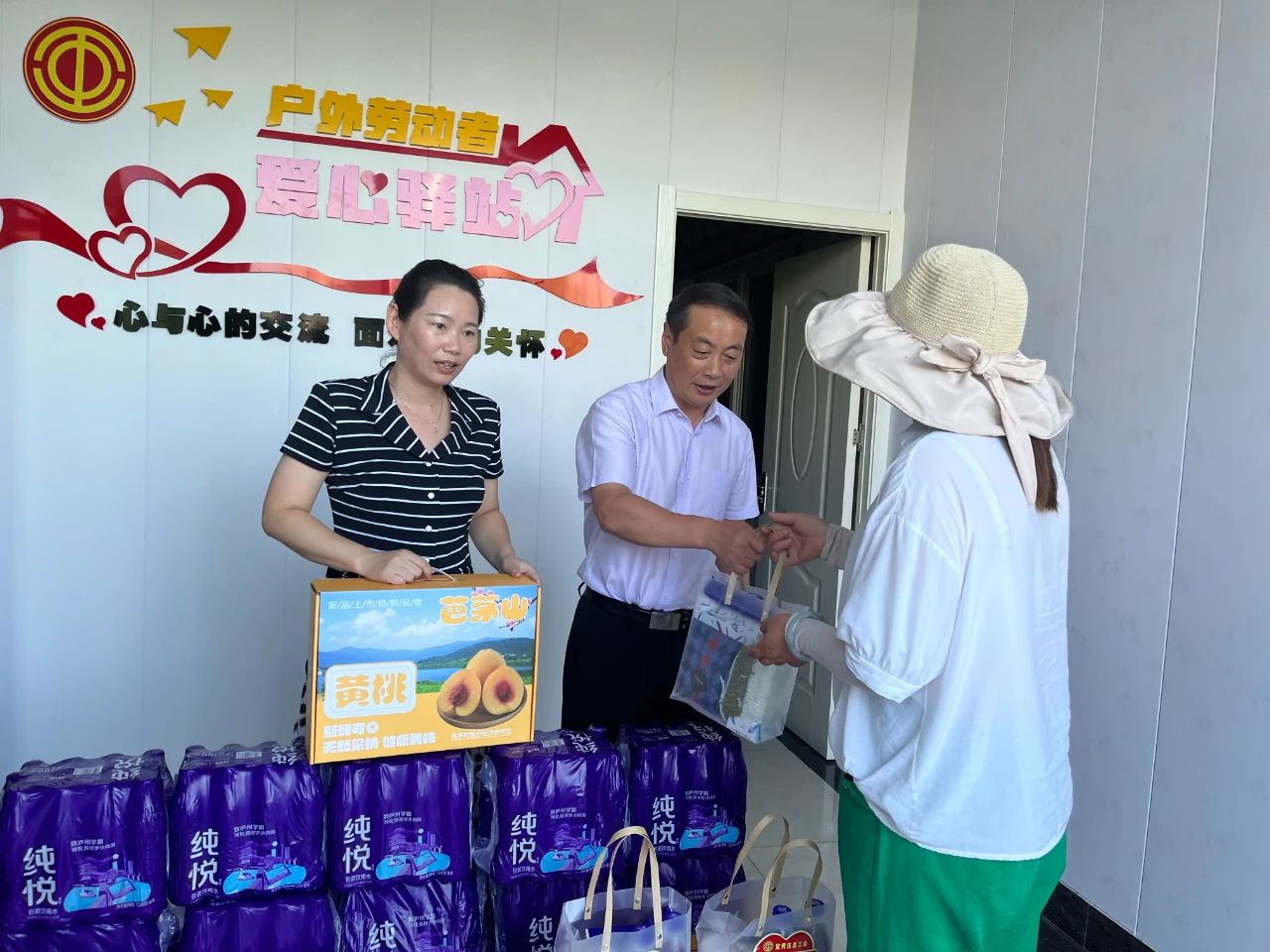 宜秀區(qū)人大副主任、區(qū)總工會主席趙永杰,市總工會權(quán)益部部長張?zhí)毂笠恍衼淼狡呓止A站,向快遞小哥等戶外勞動者們贈送了水果、清涼包、礦泉水。趙永杰感謝大家辛勤的勞動,叮囑大家要合理安排作息時間,勞逸結(jié)合,防止高溫中暑。