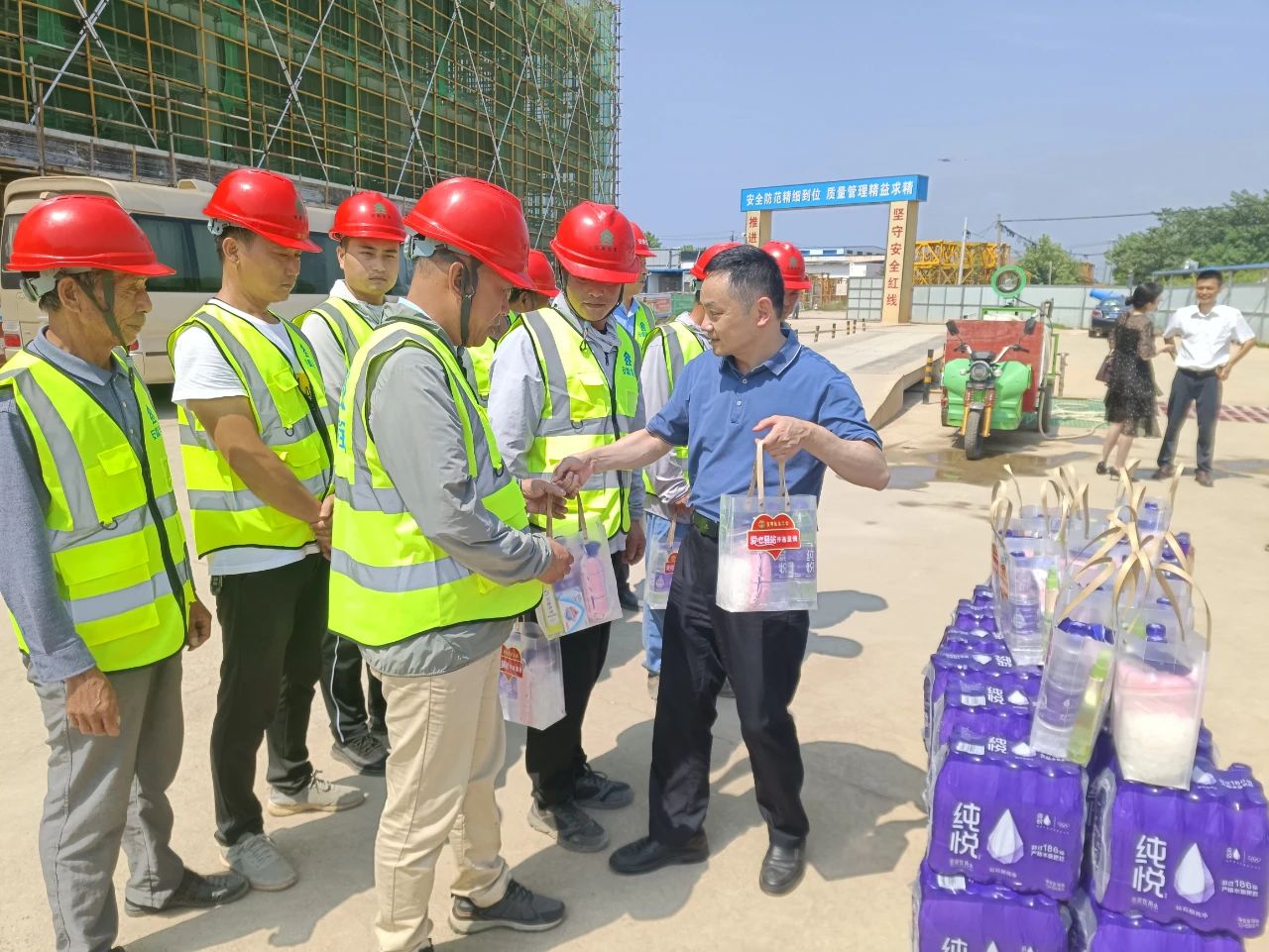 宜秀區(qū)委書記鄭志率隊來到江宸項目工地,向一線建筑工人代表們贈送清涼包、礦泉水。鄭志強(qiáng)調(diào)要把安全生產(chǎn)牢牢抓在手上,健全安全生產(chǎn)責(zé)任制,進(jìn)一步做好高溫天氣下安全生產(chǎn)和防暑降溫工作,確保勞動者身體健康和生命安全。