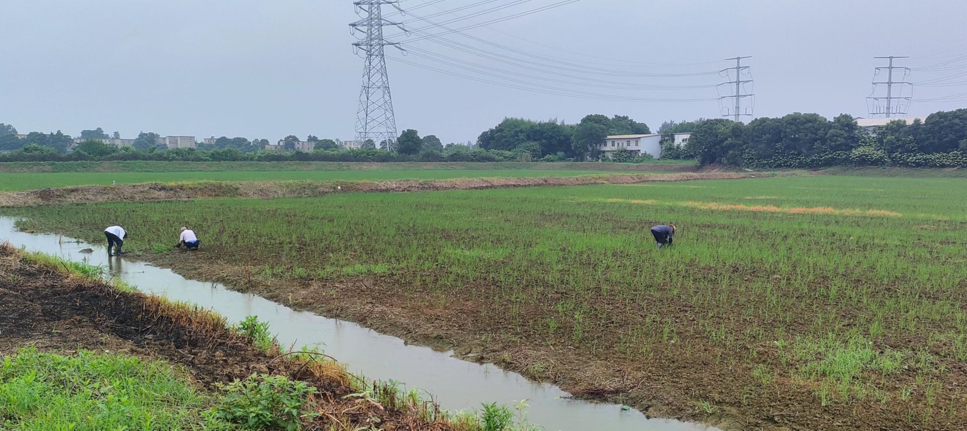 安慶市宜秀區白澤湖鄉先鋒村瓦屋組新開墾的水田里,一行行的水稻長勢良好,綠油油的葉片隨風搖曳,工作人員走進田間,正在查看撂荒地整改種植情況。