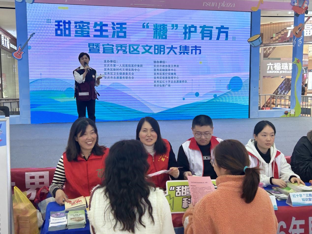 11月13日晚,安慶弘陽廣場燈火璀璨、人聲鼎沸,一場以"甜蜜生活”“糖”護有方為主題的宜秀區文明大集市活動圓滿落下帷幕。本次活動由宜秀區衛健委聯合安慶市第一人民醫院醫療集團、宜秀區新時代文明實踐中心等單位共同主辦,宜秀區紅十字會、宜秀區融媒體中心等多家單位鼎力協辦,主要以糖尿病防治科普為核心,融合多元便民服務,為市民送上一場兼具健康關懷與文明熏陶的公益盛宴。